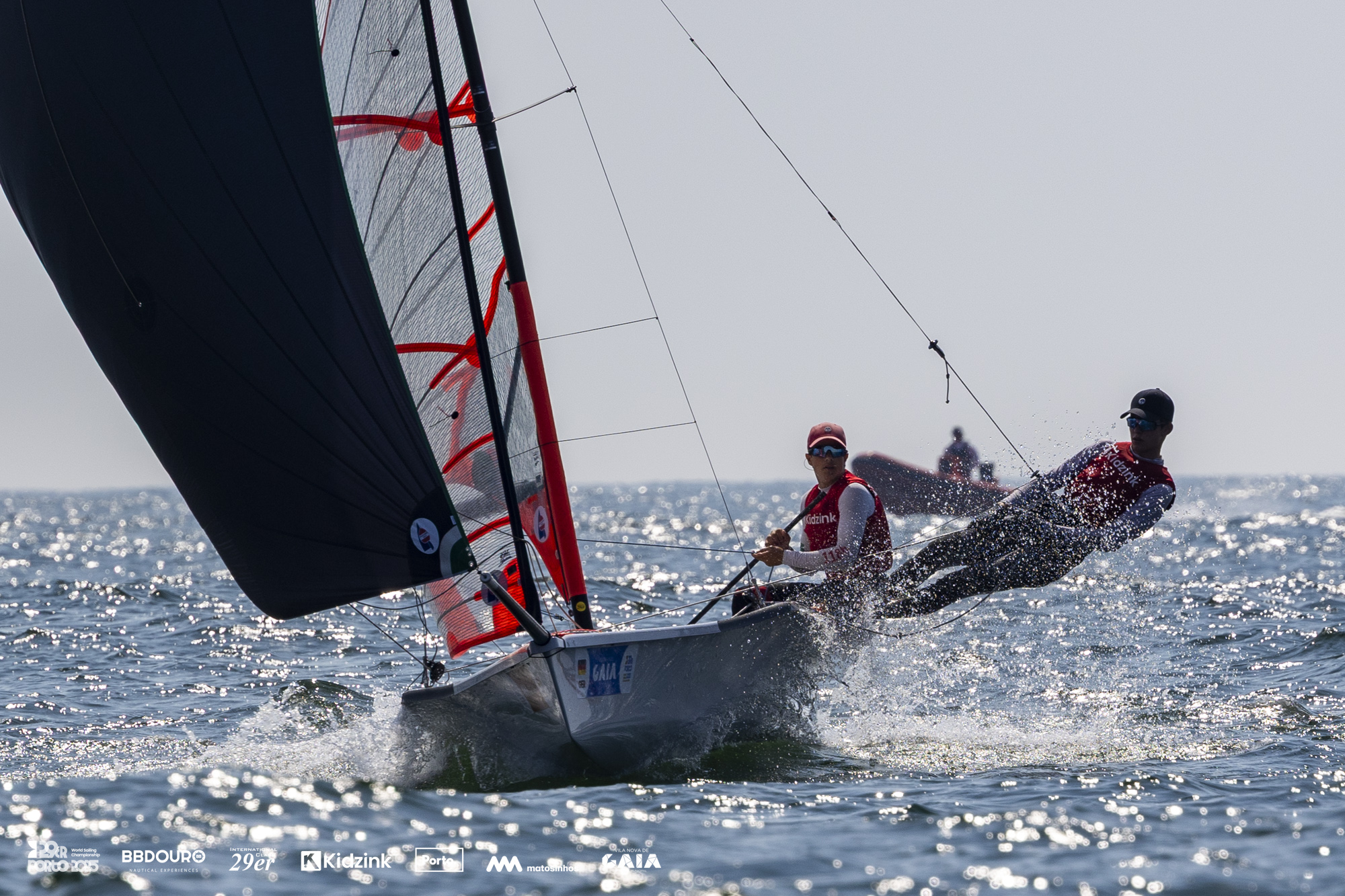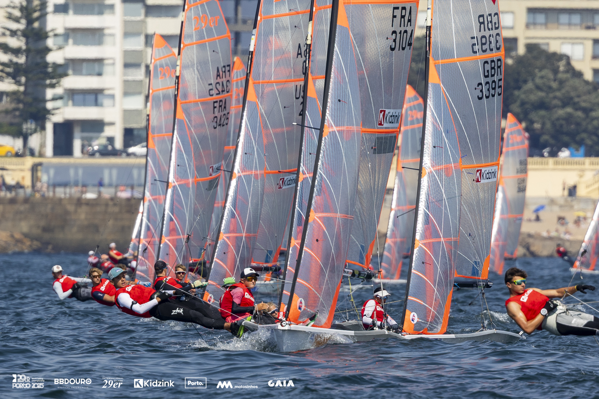 The first day of the 29er World Championships in Porto kicked off with a coaches meeting and a skippers briefing, setting the tone for a day full of energy and anticipation. Despite a late start on the water, racing began around 15:00 on Course A and 15:30 on Course B, with the fleets randomized for the day — and they will remain randomized for tomorrow’s qualifying races.
