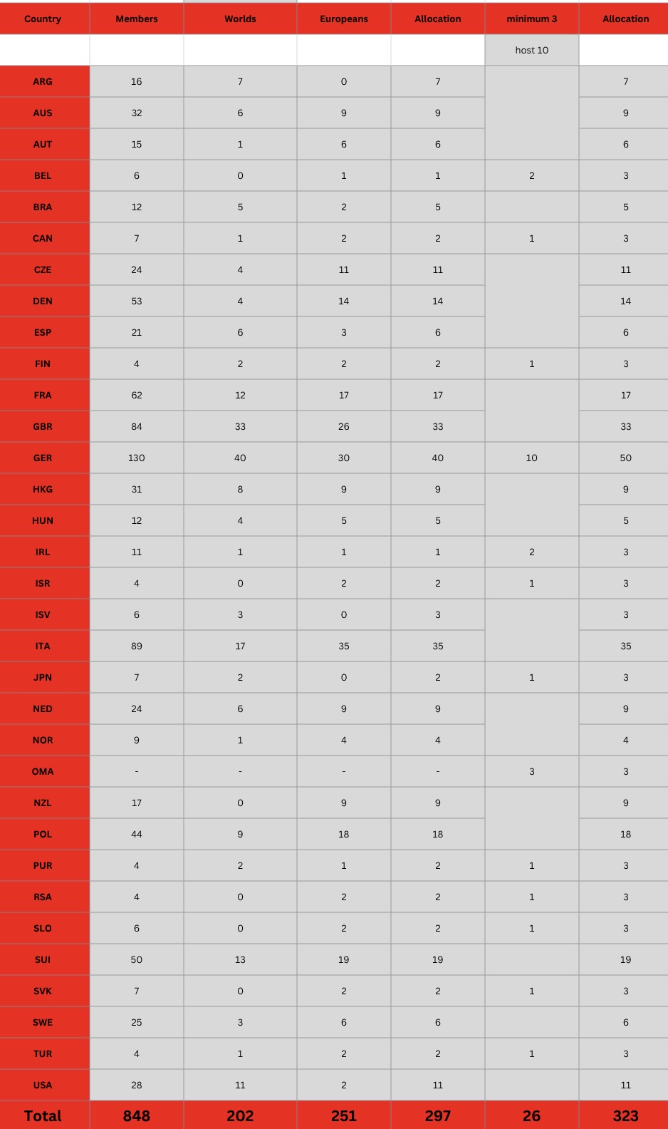 The method we will use, is to take the entries from the World or European Championships 2025 and allocate entries for 2026 on the higher of each country’s entries in either of the two Championships in 2025. All countries will be allocated a minimum of three entries. Any country that didn’t enter a championship in 2025 can apply for up to three entries in 2026. The host nation will receive 10 entries in addition to their allocated entries. The World Champions in 2025 will receive additional individual entries which may not be transferred to another pairing.